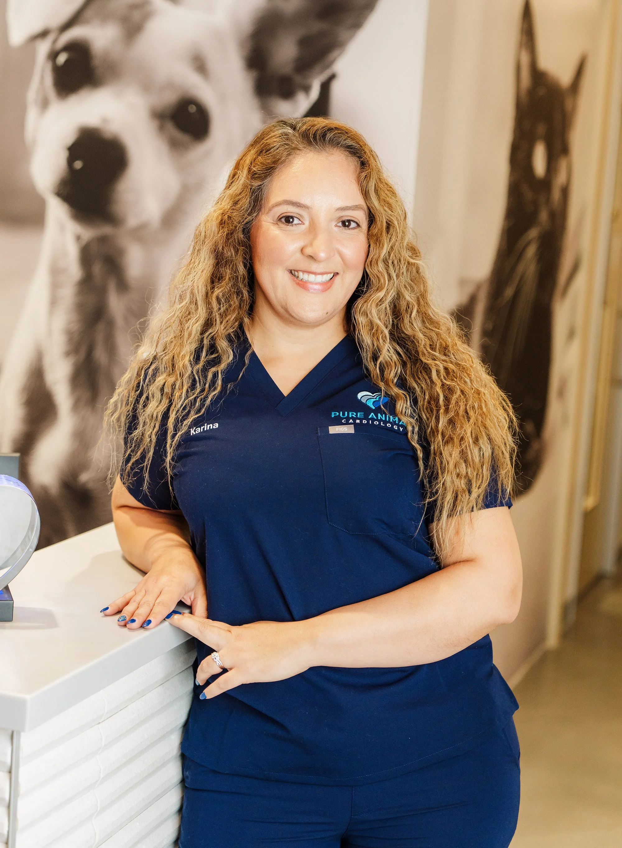 During school, Karina interned at several vet clinics, which helped her land her first job at a Specialty Animal Hospital in early 2018. She started out in the Neurology department, working with pets dealing with neurological issues, then moved over to Cardiology later that year. That’s where she met Dr. Chapel, who became a mentor and helped her dive deeper into the world of veterinary cardiology. Karina is a true-blue member of the PAC team and has been with Dr. Chapel the longest.